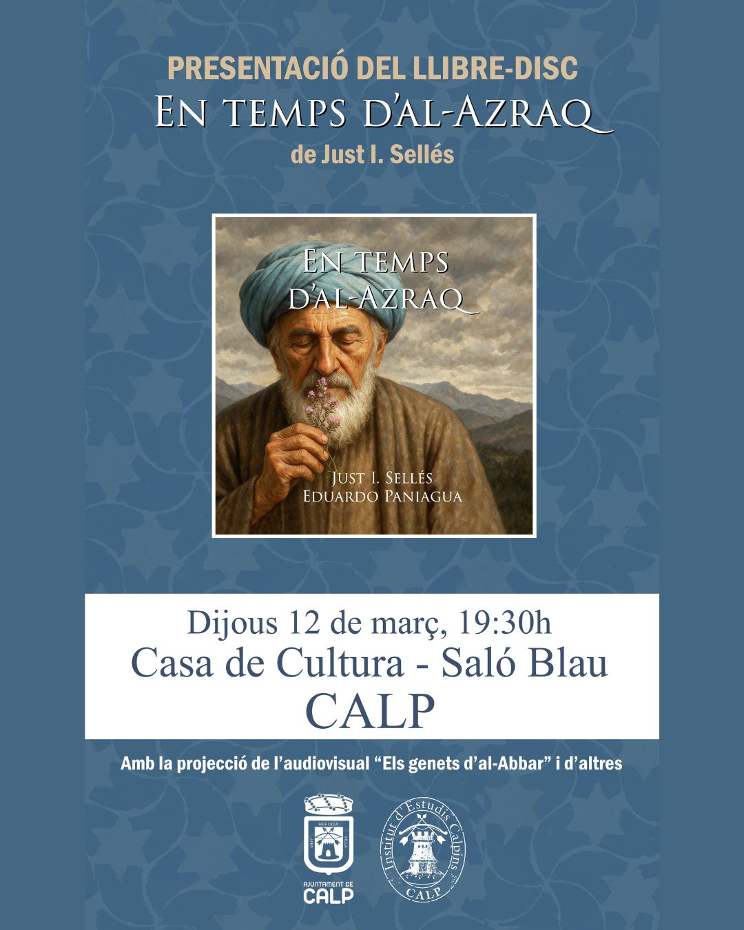 La Casa de Cultura de Calp (Saló Blau) acull el dijous 12 de març de 2026, a les 19:30 h, la presentació d’“En temps d’Al-Azraq”, de Just I. Sellés.