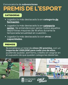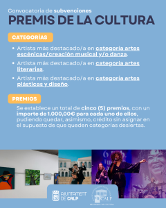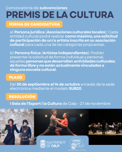 El Ayuntamiento de Calp ha abierto el plazo para presentar candidaturas a los Premios de Cultura y Deportes 2025, que se entregarán en la Gala del Deporte y la Cultura el próximo 27 de noviembre en el Auditorio de la Casa de Cultura Jaume Pastor i Fluixà.