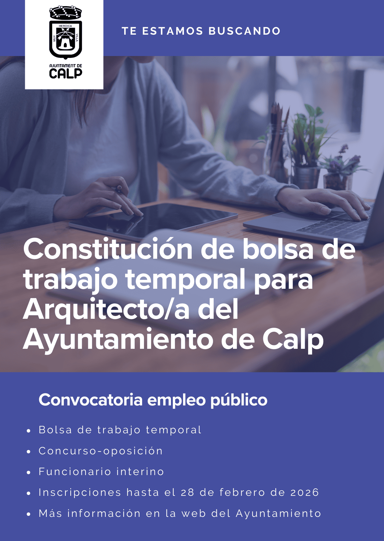 l Ayuntamiento de Calp abre el plazo de inscripción para la constitución de una bolsa de trabajo temporal de Arquitecto/a mediante concurso-oposición.