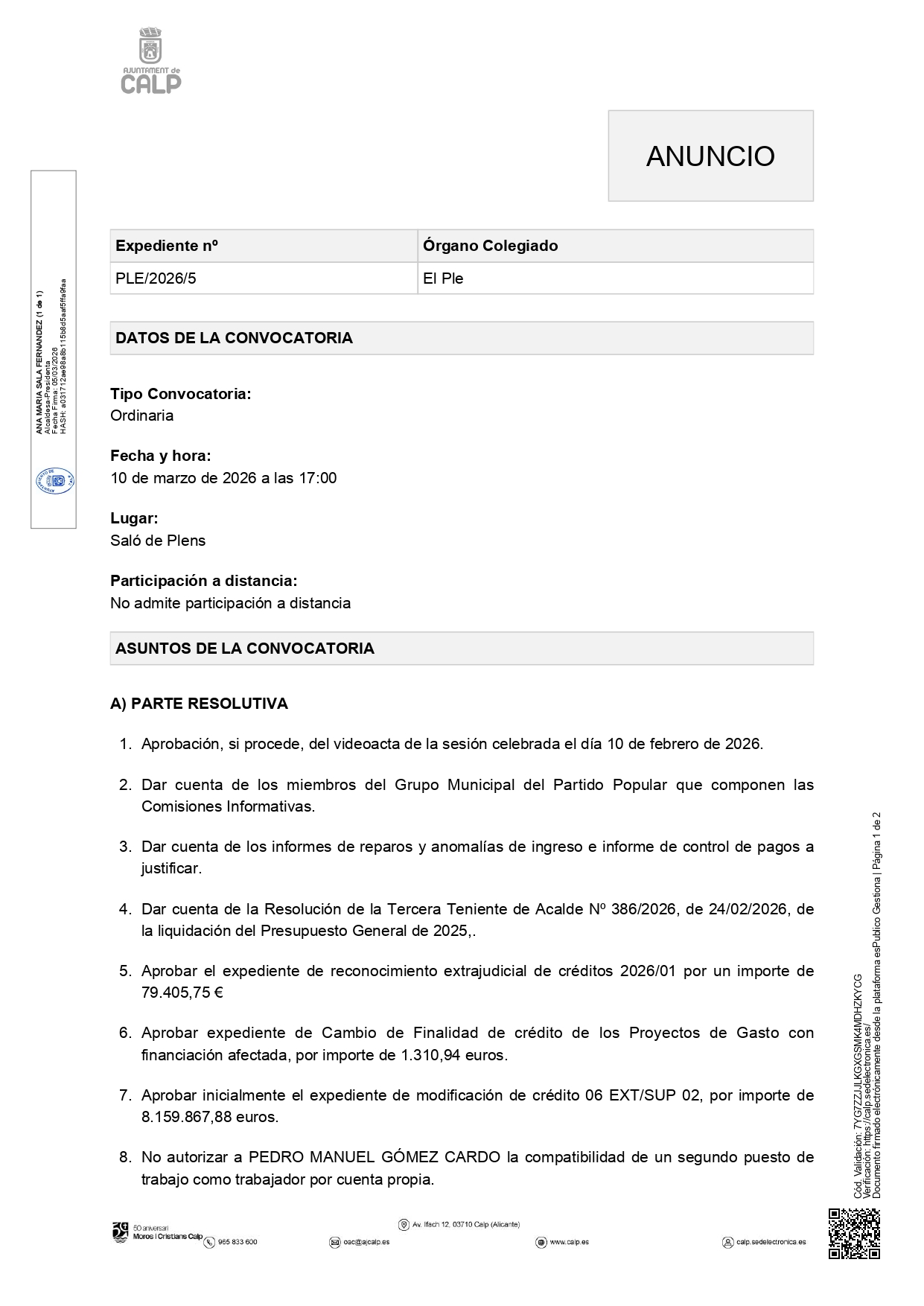 🏛️ El Ayuntamiento de #Calp celebrará el martes 10 de marzo a las 17 h pleno ordinario con este orden del día. 💻 Se podrá seguir la sesión en directo en el canal de YouTube del Ayuntamiento de Calp