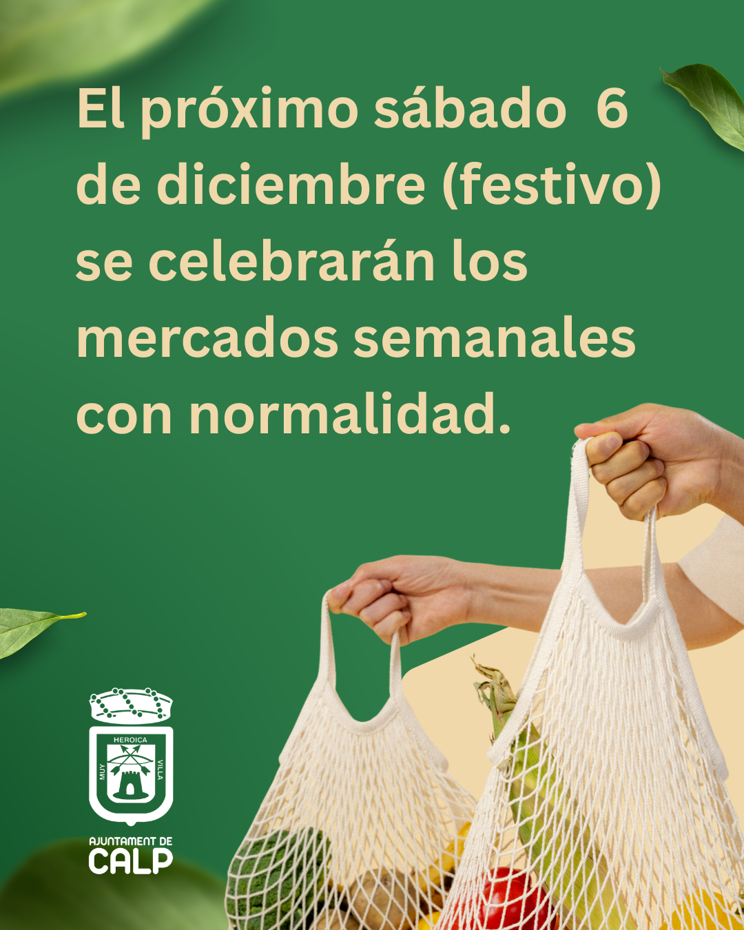 📣📣 El pròxim dissabte 6 de desembre (festiu) se celebraran els mercats setmanals amb normalitat.